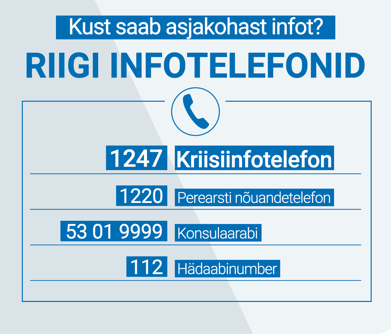 Riigiinfo telefon | 1247 | Infonumber, mis pakub infot ja nõu olukordades, mille puhul ei ole ohus elu, tervis ja vara. |