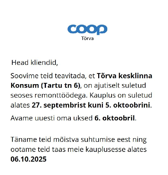 Tõrva Tarbijate Ühistu annab teada, et Tõrva kesklinna konsum (Tartu tn 6) on ajutiselt suletud 27. septembrist kuni 5. oktoobrini.